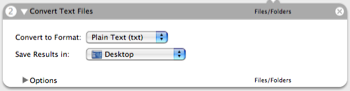 **Function:** Converts any text file of the types Plain Text, Rich Text, Word (Doc and WordML), HTML and Safari Webarchives into any other type.