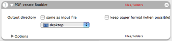 **Output**: (Files/Folders) PDF with ladscape pages, two orignal pages per resulting page, ordered binding in the middle.