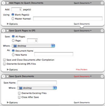 **Function:** This product includes Automator actions that can be used to automate time consuming desktop publishing tasks, such as catalog production, in QuarkXPress.